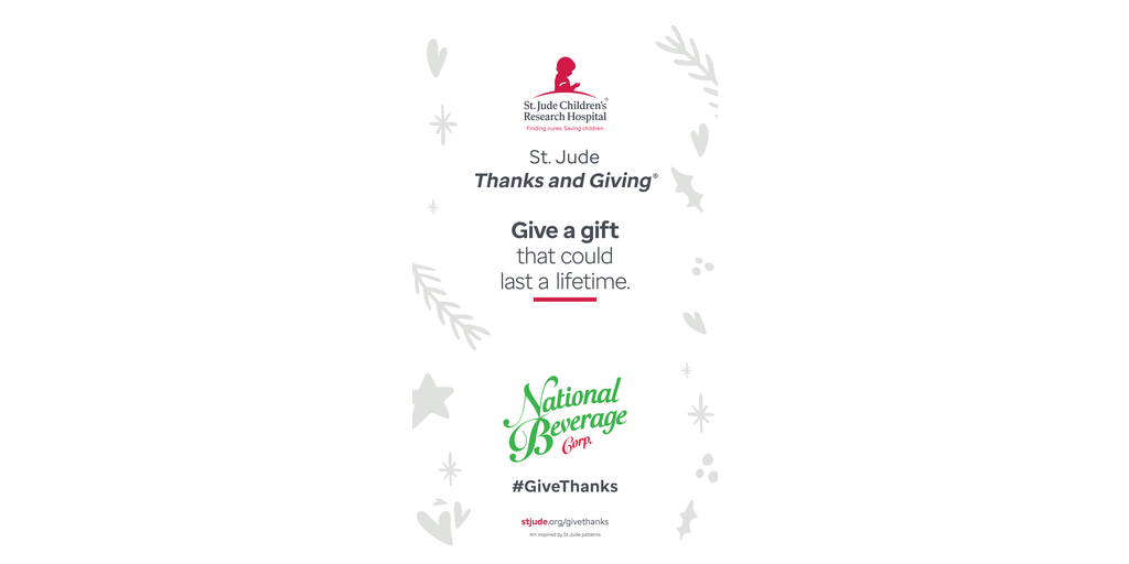 Commemorating its 31st year as a continuing partner of St. Jude Children’s Research Hospital®, National Beverage Corp. (NASDAQ: FIZZ) asks all to ‘give a gift that could last a lifetime’ by donating to St. Jude as it leads the way the world understands, treats and defeats childhood cancer and other life-threatening diseases.